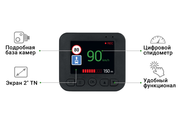 Встроенная GPS-антенна и обновляемая база данных* позволяет водителю получать актуальную информацию о камерах контроля, потенциально опасных местах и сервисных службах. Интеллектуальная система предусматривает графическое и звуковое оповещение, которое активируется за 450 метров до места расположения камеры или дорожного ограничения.