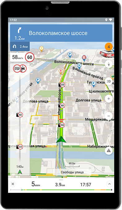 Расширенная база объектов POI (заправки, банкоматы, рестораны и т.д.) позволяет легко находить нужные места в незнакомом городе. В дорожную сеть включены все улицы и дороги с учетом направленности движения и транспортных развязок, содержится информация о расположении стационарных дорожных радаров и камер контроля скорости*.